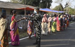 A paramilitary personnel distributes facemasks to voters standing in queue to cast their ballots outside a polling station during Phase 1 of West Bengal’s legislative election in Purulia district on March 27, 2021. — AFP ...