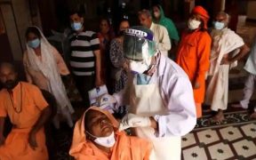 A healthcare worker wearing personal protective equipment (PPE) collects a swab sample from a female Sadhu or a Hindu holy woman amidst the spread of the coronavirus disease (COVID-19), at a temple in New Delhi, ...