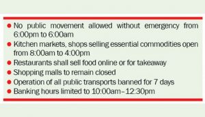 Kitchen markets and shops selling essential commodities will remain open from 8:00am to 4:00pm while restaurants shall sell food online or for takeaway.