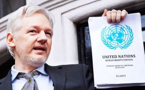 A file photo taken on February 5, 2016 shows WikiLeaks founder Julian Assange addressing the media holding a printed report of the judgement of the UN’s Working Group on Arbitrary Detention on his case from ...