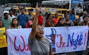 Activists shout slogans during a protest to condemn the rape and murder of a doctor in India’s West Bengal state, in Kolkata on August 25. Doctors at a top Indian government hospital ended a nearly ...