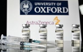 In this file photo taken on November 17, 2020 An illustration picture shows vials with Covid-19 Vaccine stickers attached and syringes, with the logo of the University of Oxford and its partner British pharmaceutical company ...