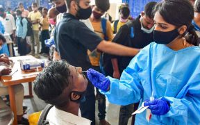 A healthcare worker conducts a polymerase chain reaction Covid test on a traveller at OR Tambo International Airport in Johannesburg on November 27 after several countries banned flights from South Africa following the discovery of ...