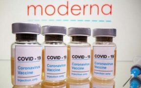 Vials with a sticker reading, “COVID-19 / Coronavirus vaccine / Injection only” and a medical syringe are seen in front of a displayed Moderna logo in this illustration taken on October 31, 2020. File Photo: ...