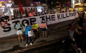 Journalists and activists call for justice and the protection of media workers during a rally following the killing of Filipino radio journalist Percival Mabasa, in Quezon City, the Philippines, on October 3, 2022 [Eloisa Lopez/Reuters] ...