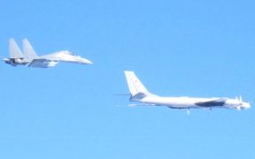 This handout photo taken on December 9, 2025 and received on December 10, 2025 from Japan’s Ministry of Defense shows a Chinese J-16 fighter jet (L) and a Russian Tu-95 bomber during a joint flight ...