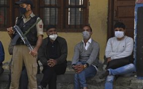 An Indian policeman stands guard next to teachers inside a government-run school on the outskirts of Srinagar on October 7, 2021, after suspected anti-India extremists shot dead two schoolteachers in Indian-administered Kashmir. – AFP photo ...