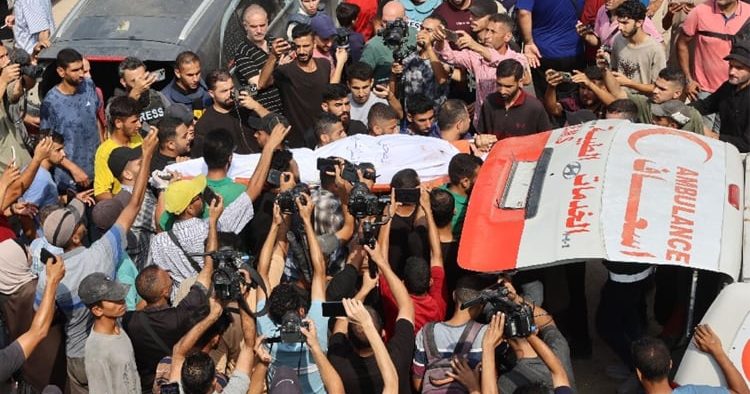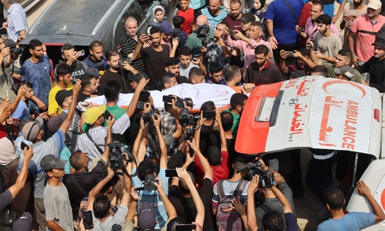Mourners including men wearing blue journalists’ flak jackets carried their bodies, wrapped in white shrouds with their faces exposed, through narrow alleys to their graves.